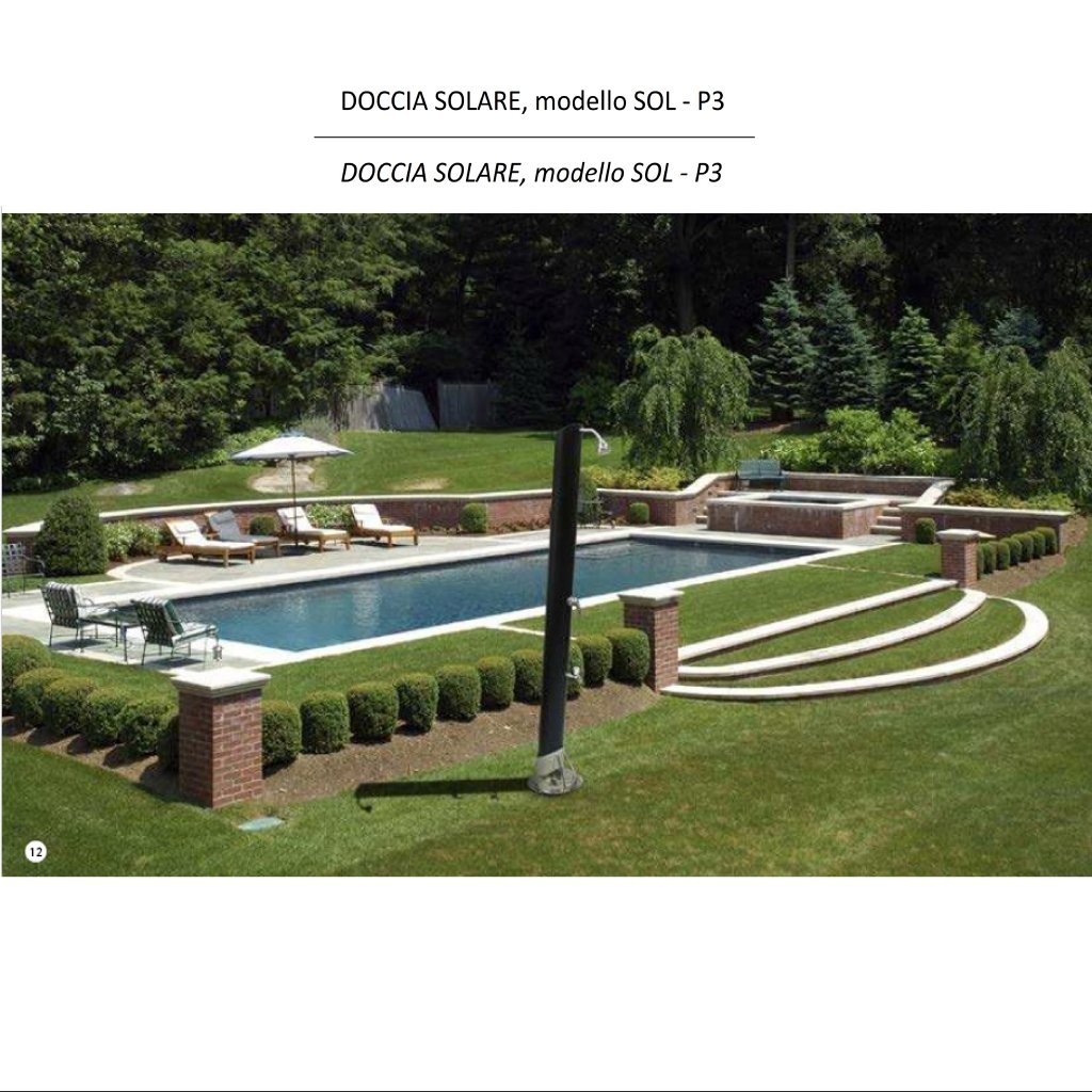 Il design della doccia, di forma circolare, è stato studiato al fine di consentire il posizionamento in ogni direzione assicurando sempre l’assorbimento dei raggi solari a 360°. Gli accessori idraulici quali miscelatore, soffione doccia, ecc. sono in materiali nobili opportunamente trattati. Le guarnizioni in gomma sono appositamente studiate per uso esterno del tipo utilizzato nel settore automobilistico. In una buona giornata d’insolazione e con prelievi ripetuti, la doccia SOL-P3 può erogare circa 50 litri di acqua calda sanitaria a temperatura d’utilizzo.